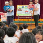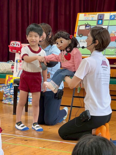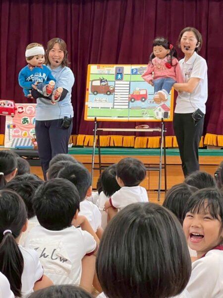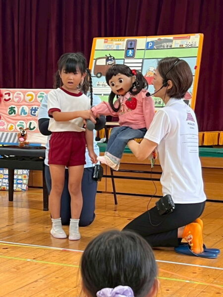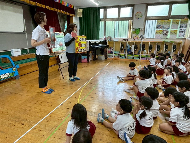 鹿児島市役所から交通安全指導員の先生方を招き、腹話術やパネル、DVDなどを用いて交通安全について楽しく学びました。