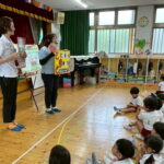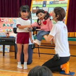 指導員の先生方が「こうちゃん」と「いちごちゃん」というお友達(人形)を連れてきてくれて、腹話術をしてくださり、子どもたちとのふれあいを交えながら楽しく指導をしてくださいました。